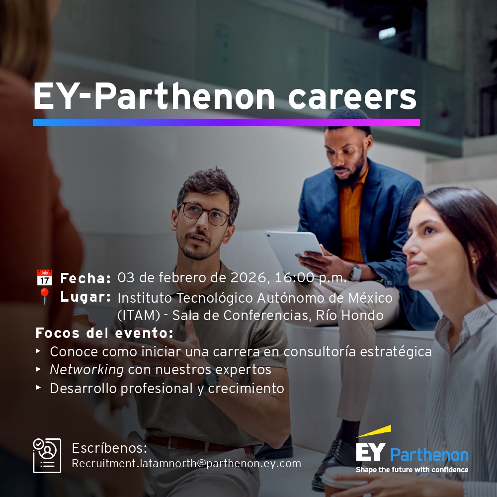 EY Parthenon, en conjunto con la Oficina de Career Services del ITAM te invita a su sesión de reclutamiento presencial, dirigida a todos los alumnos de último semestre y exalumnos (máximo dos años de haber egresado) de las licenciaturas en Administración, Contaduría Pública y Estrategia Financiera, Dirección Financiera, Economía, Matemáticas Aplicadas y de las ingenierías en Negocios e Industrial.