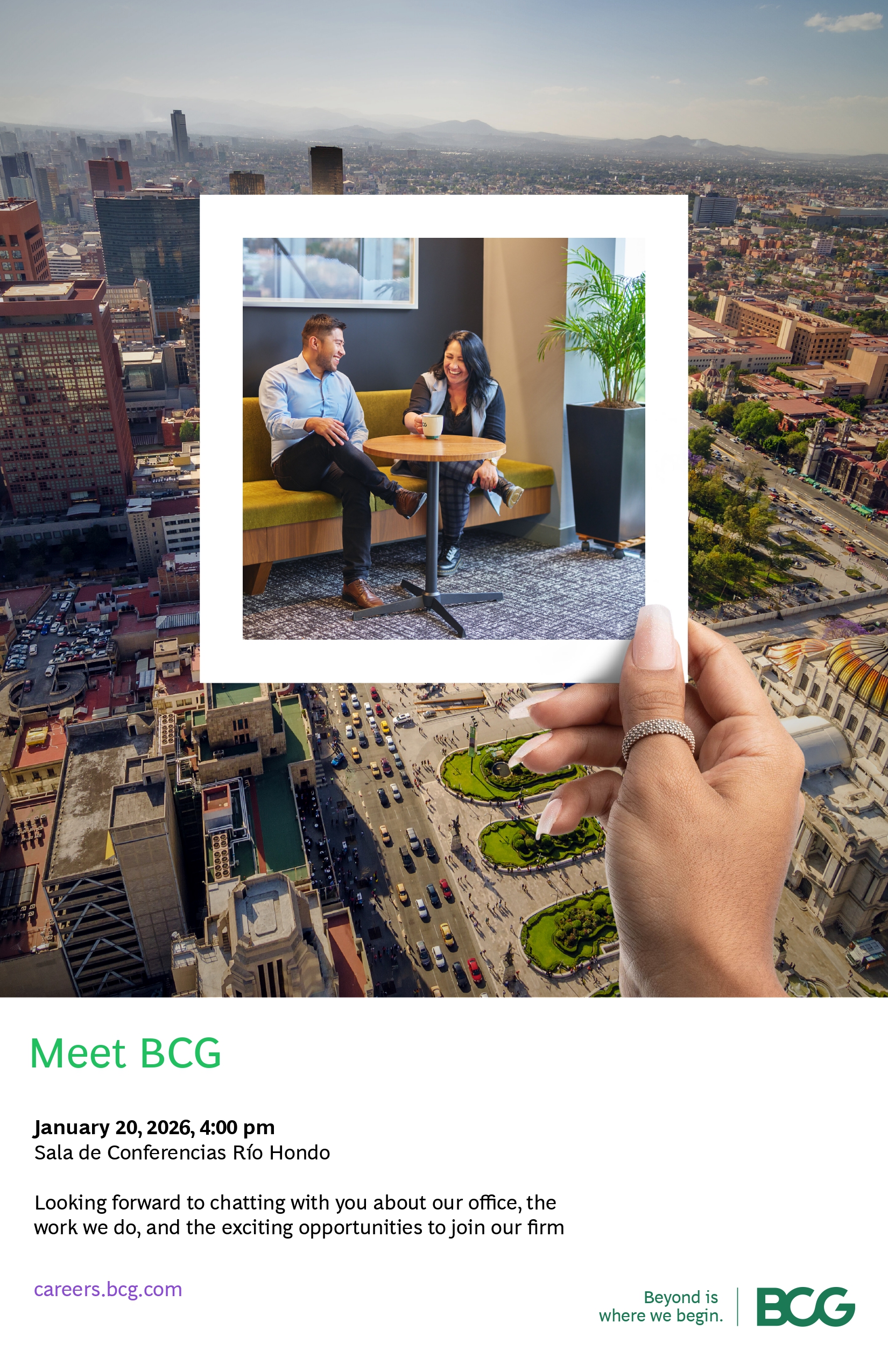 Boston Consulting Group, en conjunto con la Oficina de Career Services del ITAM te invita a su sesión de reclutamiento presencial, dirigida a todos los alumnos de los últimos dos semestres y exalumnos (hasta dos años de haber egresado) de todas las licenciaturas e ingenierías.