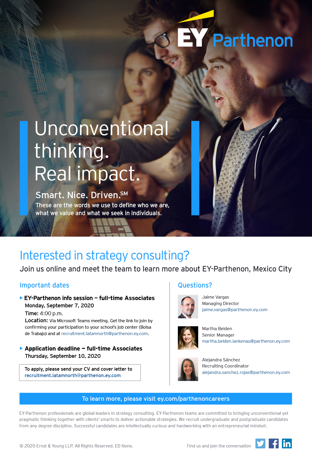 EY-Parthenon en conjunto con la Oficina de Career Services del ITAM te invita a su sesión de reclutamiento remota, dirigido a todos los alumnos de los 2 últimos semestres y exalumnos (máximo un año de haber egresado) de Actuaría, Administración, Ciencia de Datos, Dirección Financiera, Economía, Matemáticas Aplicadas y de todas las ingenierías.