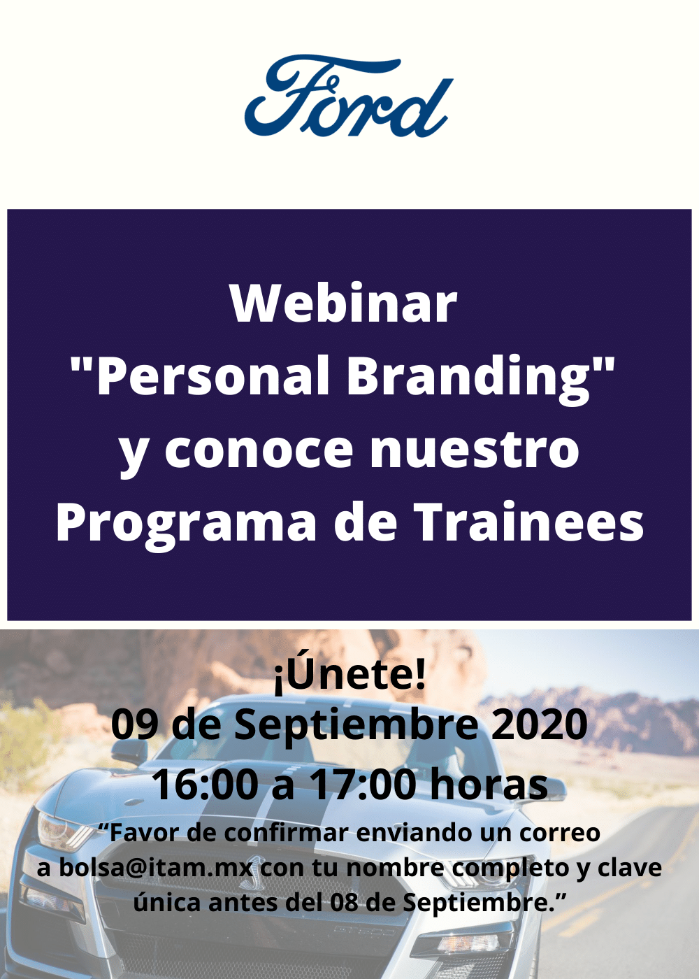 Ford Motor Company en conjunto con la Oficina de Career Services del ITAM te invita a su sesión de reclutamiento remota y Webinar "Personal Branding", dirigida a alumnos que cursen sus últimos dos semestres y recién egresados (máximo 2 años de haber egresado) de todas las licenciaturas y todas las ingenierías.